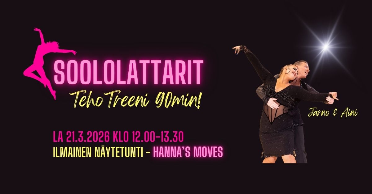 Lauantaina 21.3.2026 klo 12.00-13.30 saamme vieraaksemme Jumppahuoneelle kokeneen kilpatanssiparin - Jarnon & Ainin ohjaamaan meille ILMAISENA näytetuntina Soololattarit TehoTreenin 90min. Tällä teematunnilla keskitytään kokonaisvaltaiseen liikkeen kehittämiseen. Aluksi teemme liikkuvuusharjoitteita, jotka valmistavat kehoa sulaviin ja hallittuihin liikkeisiin. Seuraavaksi tanssia! Askeleet ovat helposti napattavia ja pääpaino on liikkumisessa musiikin tahtiin ja tanssin ilossa!. Seuraavaksi sykkeen nostoa tanssien yhdistettynä ja tunti kruunataan lihaskuntoharjoitteisiin, jotka vahvistavat kehoa ja tukevat kestävyyttä.